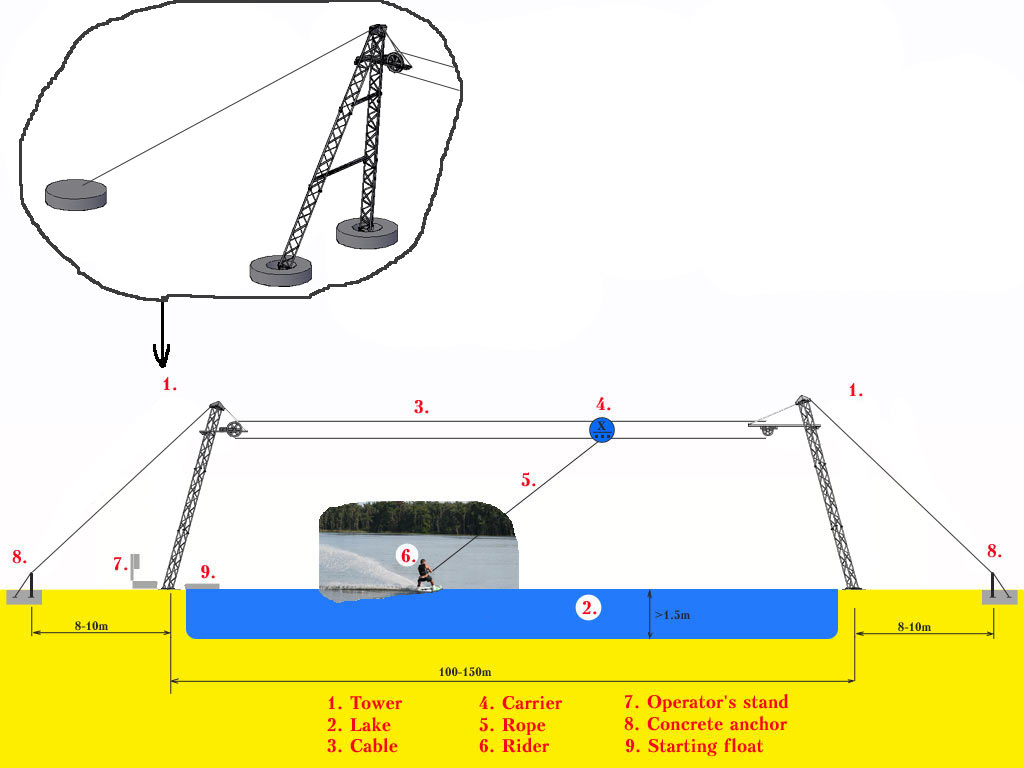 Воднолыжная канатная дорога предназначена для культивирования основных видов воднолыжного спорта - парная лыжа, слаломная монолыжа, фигурная лыжа, прыжки с трамплина, езда на пятках, и дополнительных видов вейкборд, ниборд, диск, скай-ски. Также возможно развлекательное катание на низких скоростях на бананах плюшках и т.д.